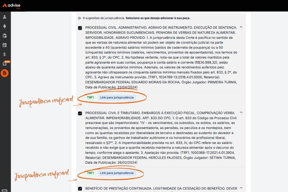 A Advise desenvolveu a IAdvise, uma inteligência artificial criada exclusivamente para o Direito brasileiro e que resolve exatamente esse problema: ela gera peças processuais com jurisprudência válida e verificável, com link direto para o acórdão oficial no tribunal correspondente.