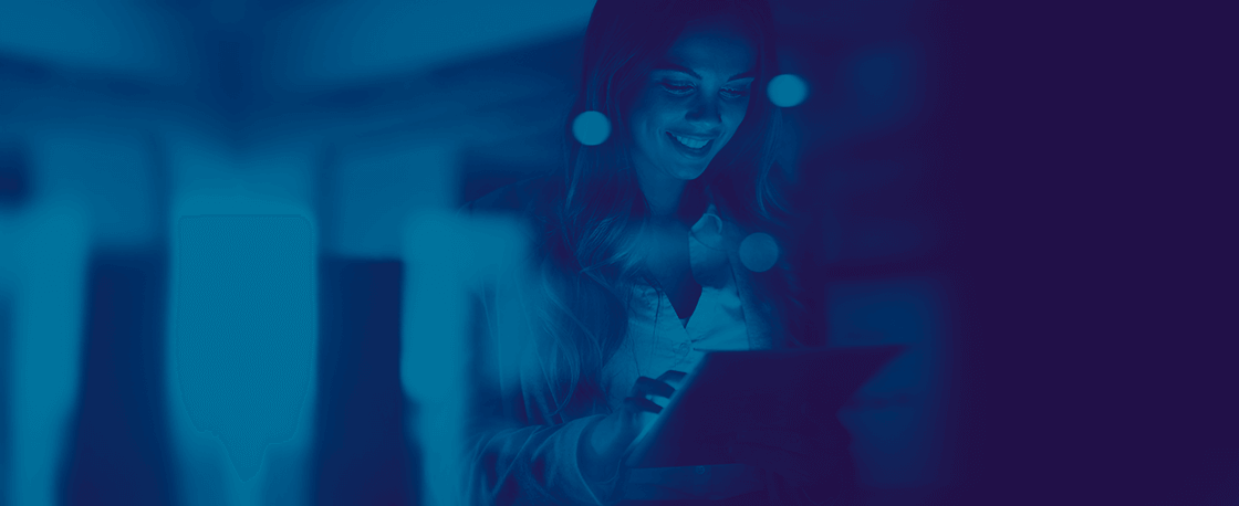 Mulher branca ao fundo desfocada, tocando a tela com elementos tecnológicos e um cadeado ao centro cercado de elementos tecnológicos representando segurança online